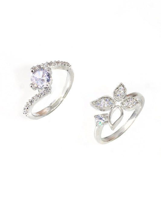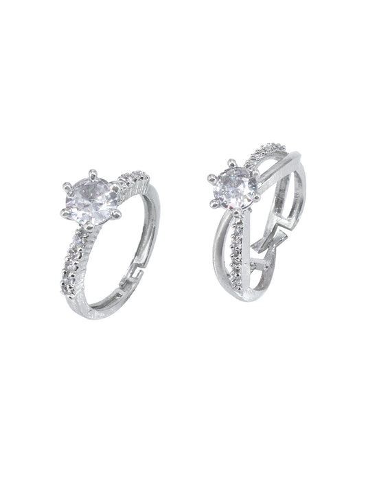 Set Of Two Rhodium Plated Solitaire American Diamond Trendy Adjustable Finger Rings