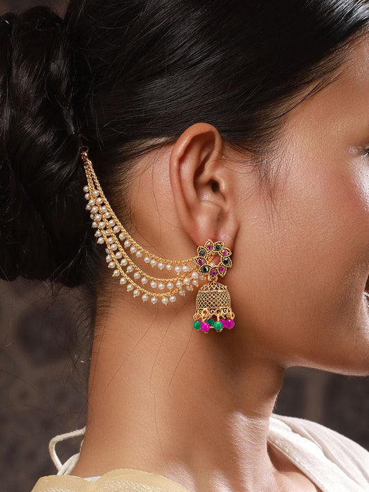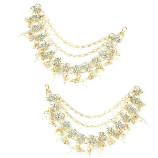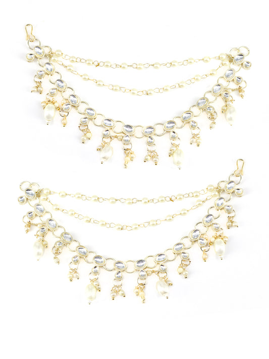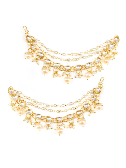 Gold-plated 3-Layered Kundan-Studded & Faux-Pearl Drop Ear Chain