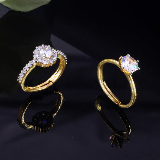 Set Of Two Gold Plated Solitaire American Diamond Trendy Adjustable Finger Rings
