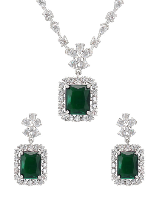 Green Rhodium-Plated American Diamond Studded Jewellery Set