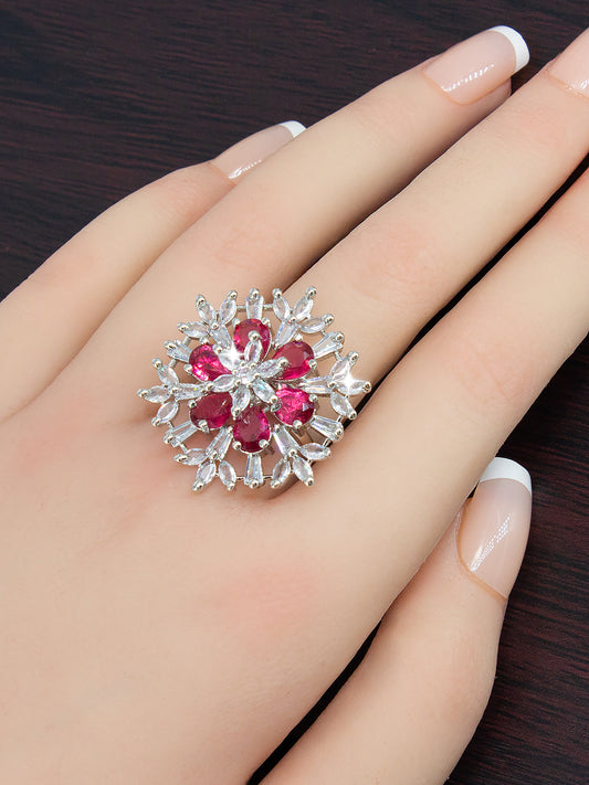 Silver-Plated AD Ruby Cocktail Adjustable Finger Ring