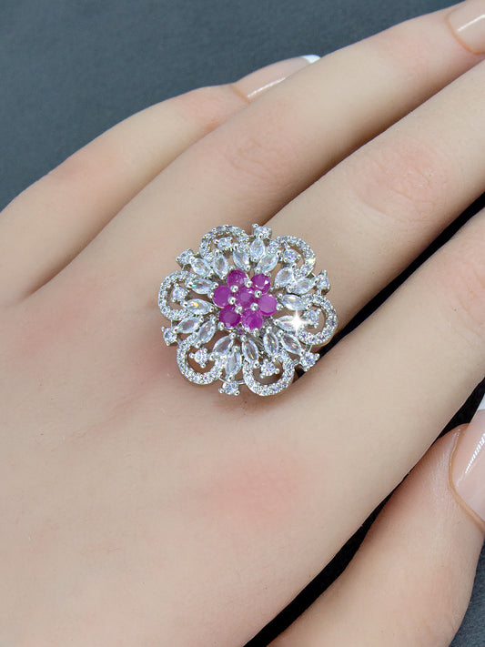 Silver-Plated American-Diamond Big Floral Cocktail Adjustable Finger Ring