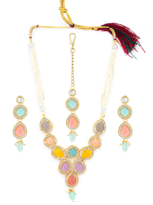 Gold-Plated Crystal Studded & Beaded Jewellery Set With Maangtika