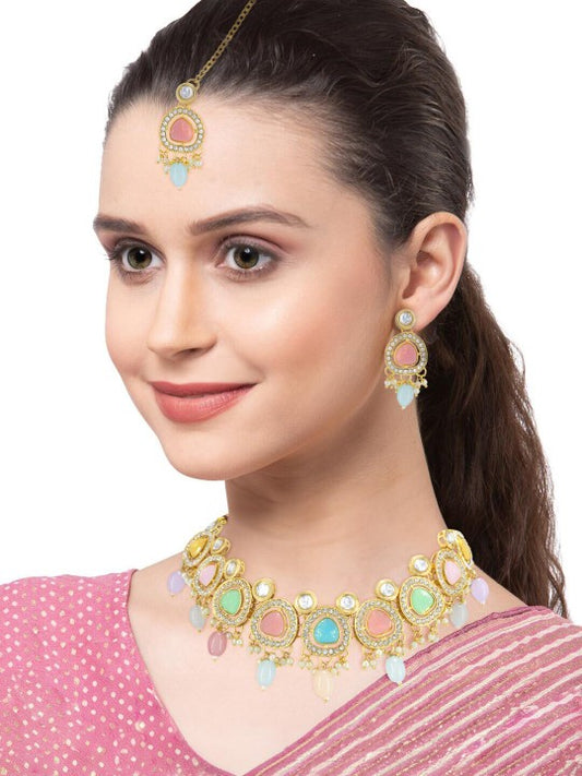 Gold-Plated Kundan Studded & Beaded Jewellery Set With Maangtika