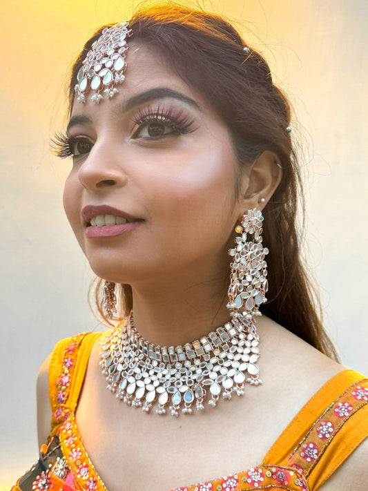 Rose Gold-Plated Mirror-Studded Jewellery Set With Maangtika