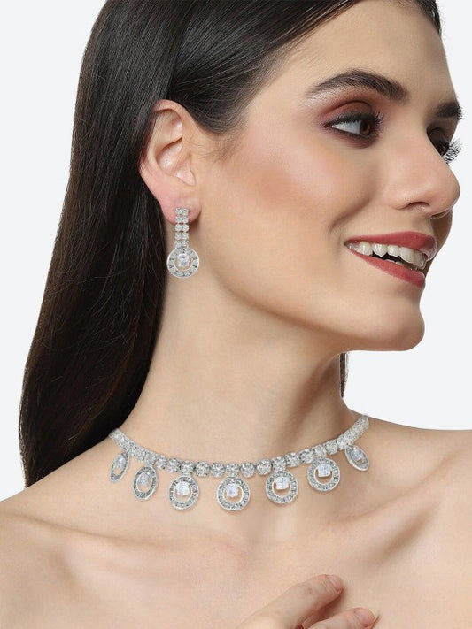 Silver Plated CZ Studded Circular Shaped Pendant & Studs Set