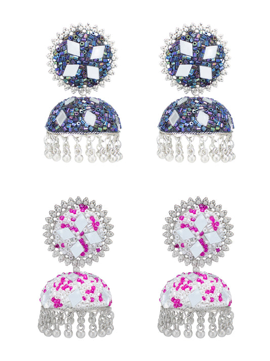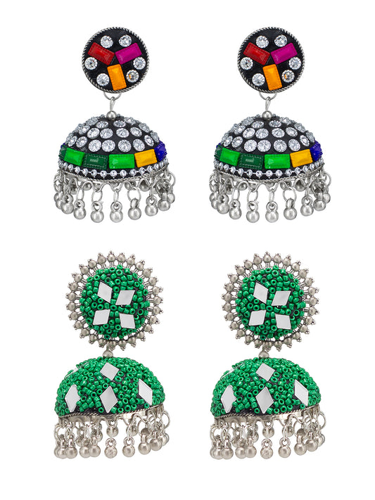 Pack of 2 Silver-Plated Stones Studded and Beaded Dome Shaped Jhumkas