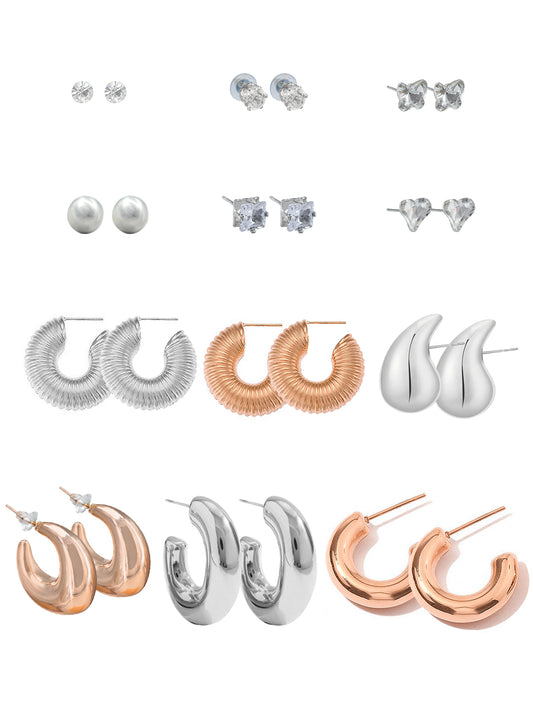 Pack of 12 Silver Plated & Rose Gold Plated Drop, Hoop & Studs Earrings