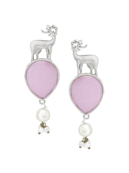 Silver Plated Deer Shaped Pink Monalisa Stone Studded Drop Earrings