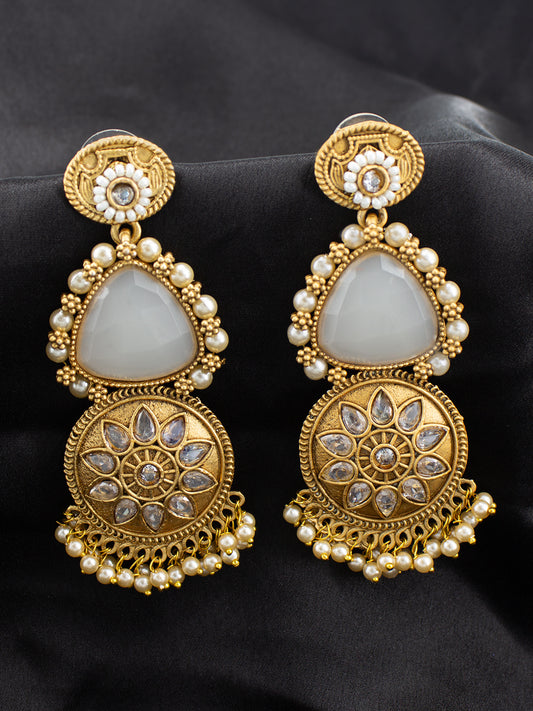 Gold Plated Floral White Kundan & Beaded Drop Earrings