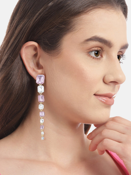 Gold Plated Pink & White Crystal Stones Studded Long Drop Earrings
