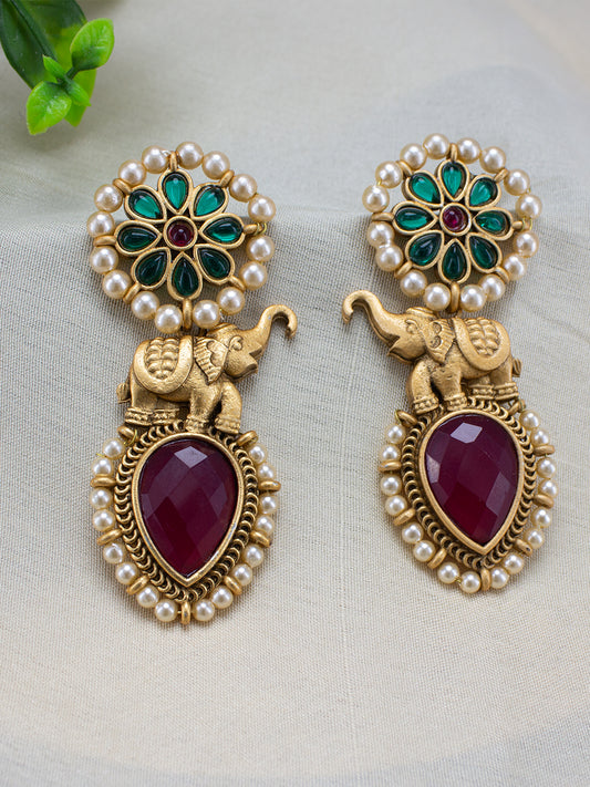 Gold-Plated Stone-Studded & Beaded Contemporary Drop Earrings