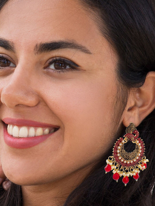 Gold-Plated Red Peacock Shaped Beaded Chandbalis Earrings