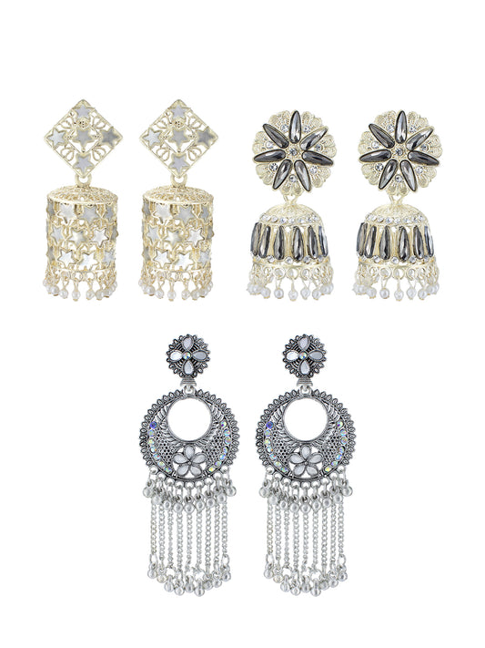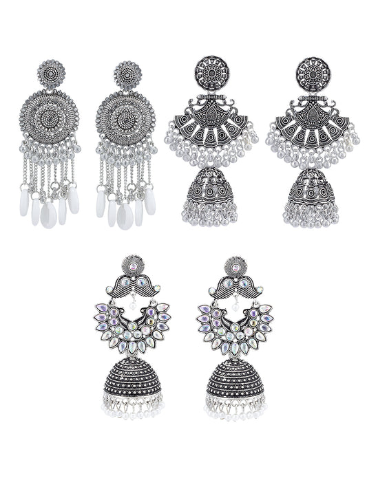 Pack of 3 Silver Oxidised Chandbali Jhumka Earrings