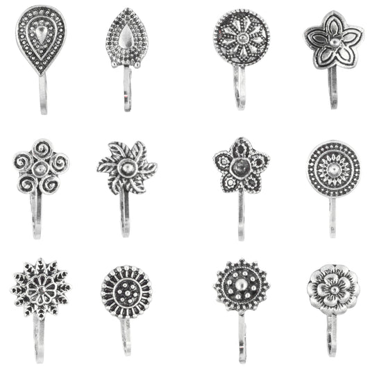 Set of 12 Silver-Oxidised Floral Non-Piercing Nosepins