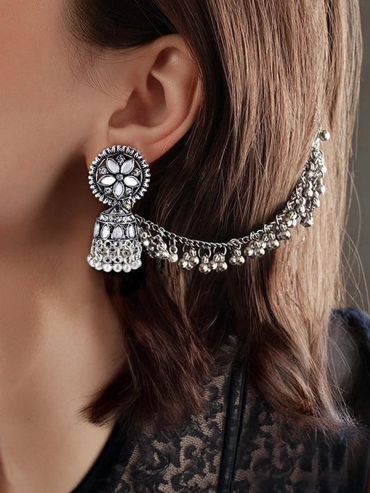 Silver-Oxidised Floral Mirror-Studded Jhumka Earrings With Hair Chain