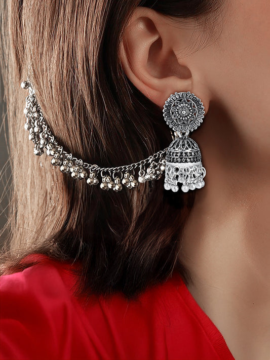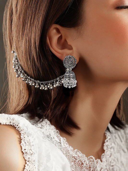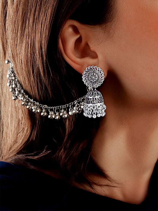 Silver-Oxidised Floral Jhumka Earrings With Ear Chain