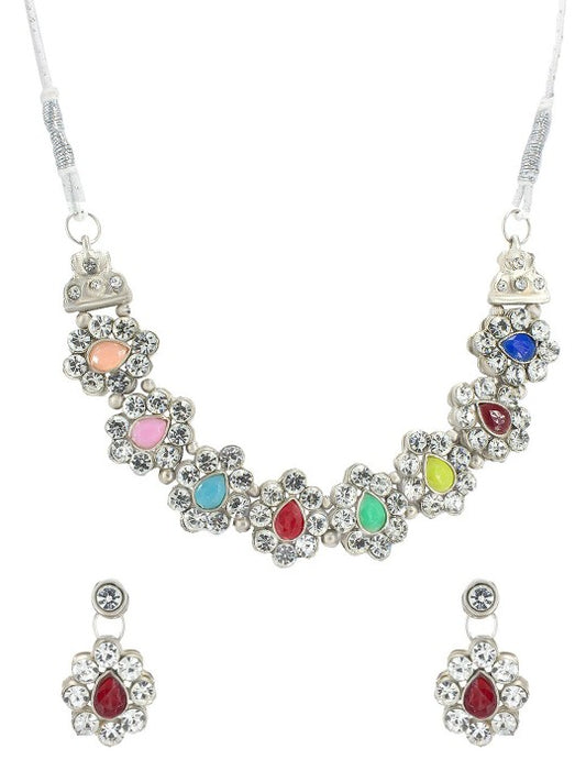 Silver Oxidised Multi Color Stone Studded Floral Jewellery Set