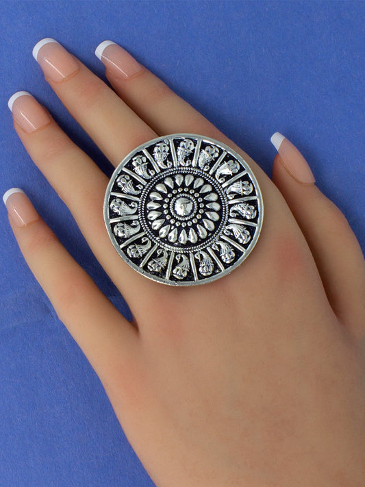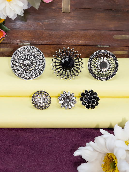 Set of 6 Silver Oxidised Black Artificial Stone Floral Adjustable Finger Ring