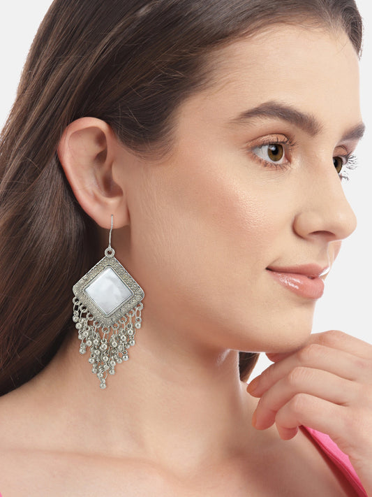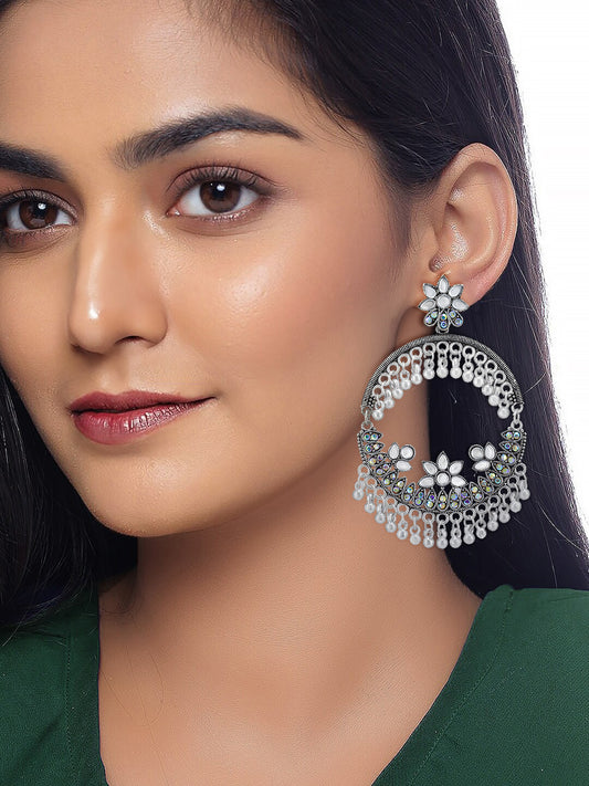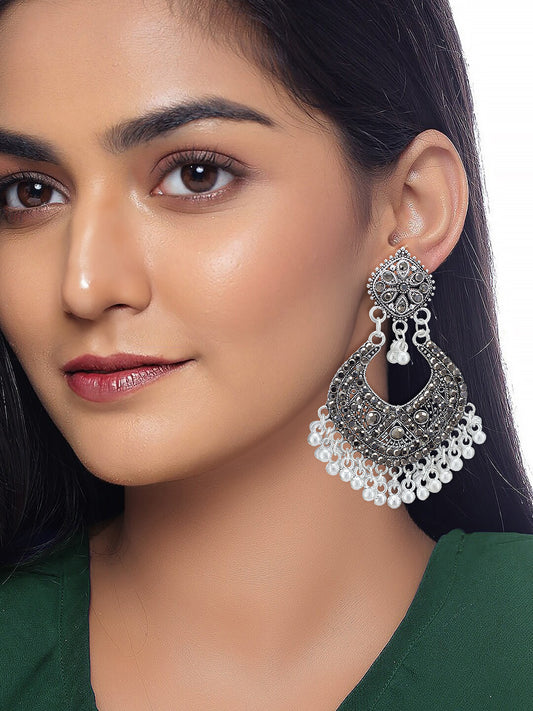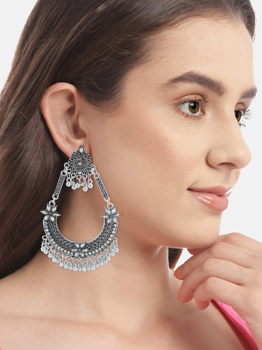 Silver Oxidised Artificial Stones & Beads Chandbali Earrings