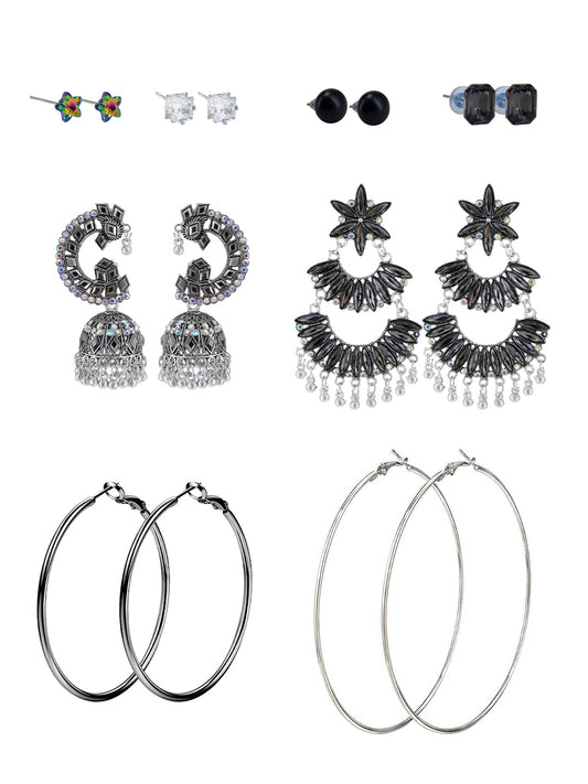 Pack of 8 Silver Oxidised Jhumka, Hoops & Studs Earrings Combo