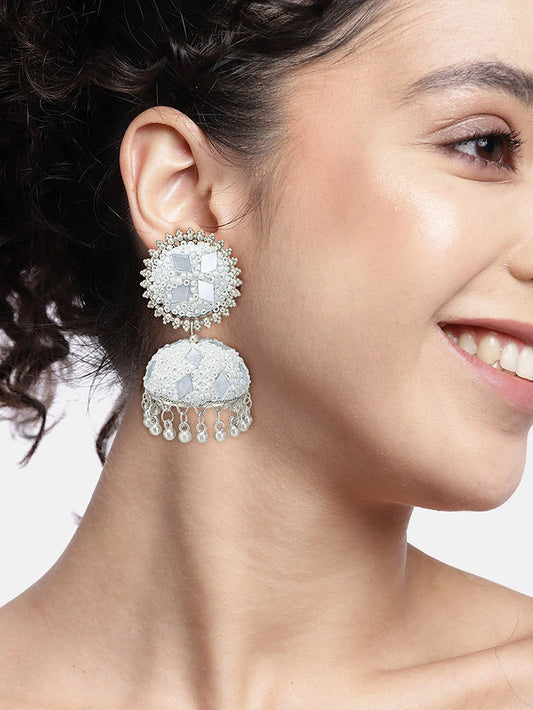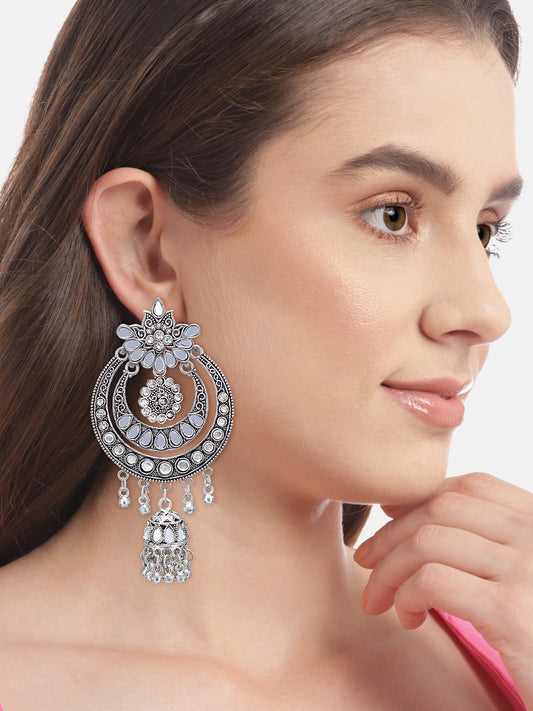 Silver Oxidised White Mirror & Artificial Stones Studded Jhumka Earrings