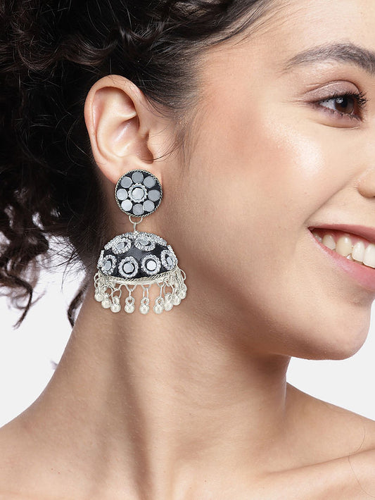 Silver Oxidised Black Mirror & Artificial Stones Studded Jhumka Earrings