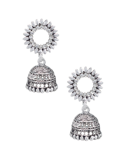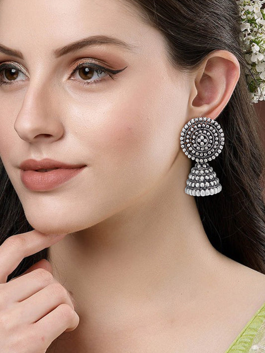 Silver Oxidised Circular CZ Studded Jhumki Earrings For Women