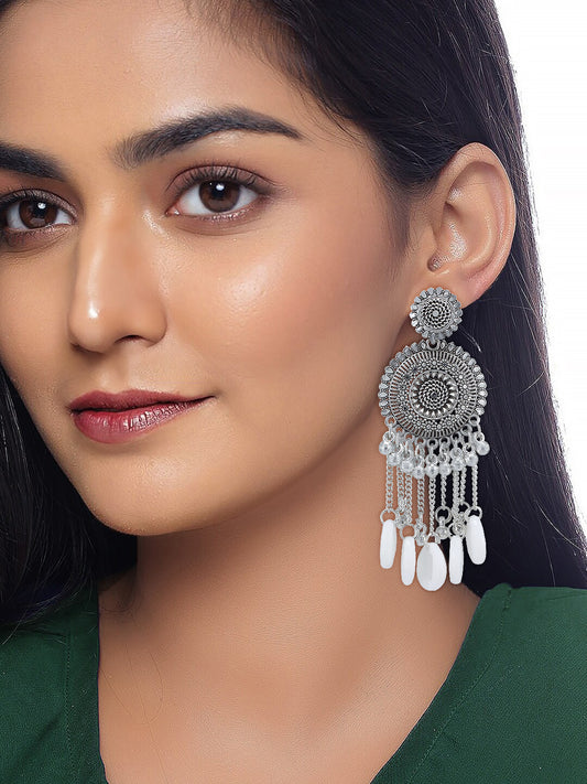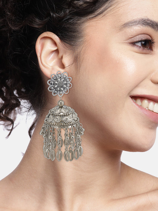 Silver Oxidised Floral & Artificial Shels Beads Jhumka Earrings