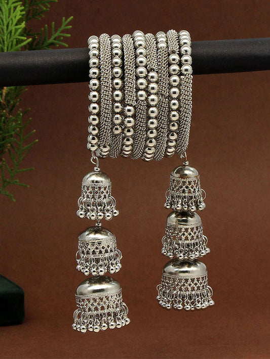Silver Oxidised Multistrand Wraparound Bracelet with Three Layer Jhumki