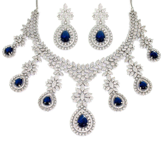 Rhodium-Plated Blue Statement AD-Studded Bridal Jewellery Set
