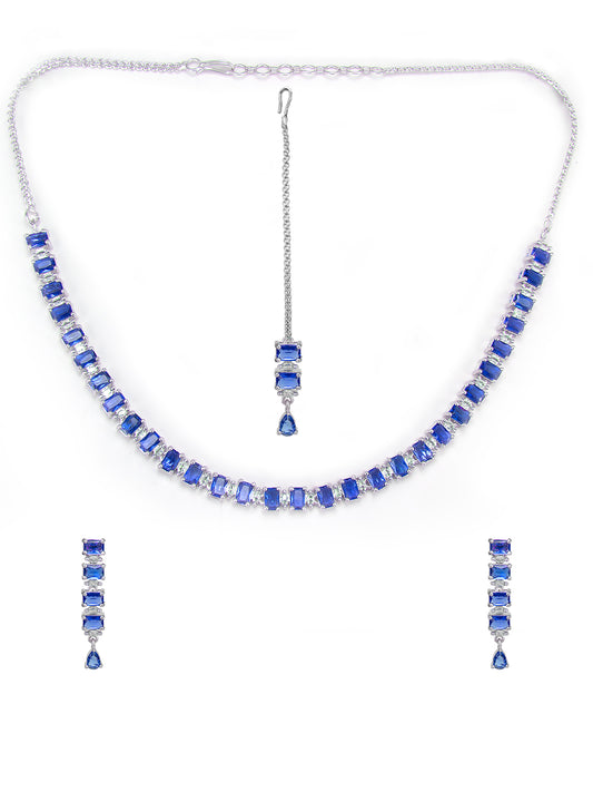 Rhodium-Plated Blue American Diamond Studded Jewellery Set With Maangtika