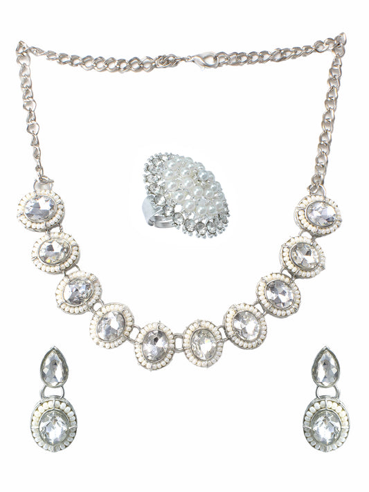 Silver-Plated Kundan-Studded & Beaded Jewellery Set With Adjustable Finger Ring