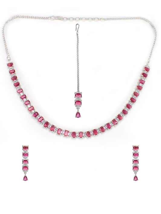 Rhodium-Plated Red American Diamond Studded Jewellery Set With Maangtika