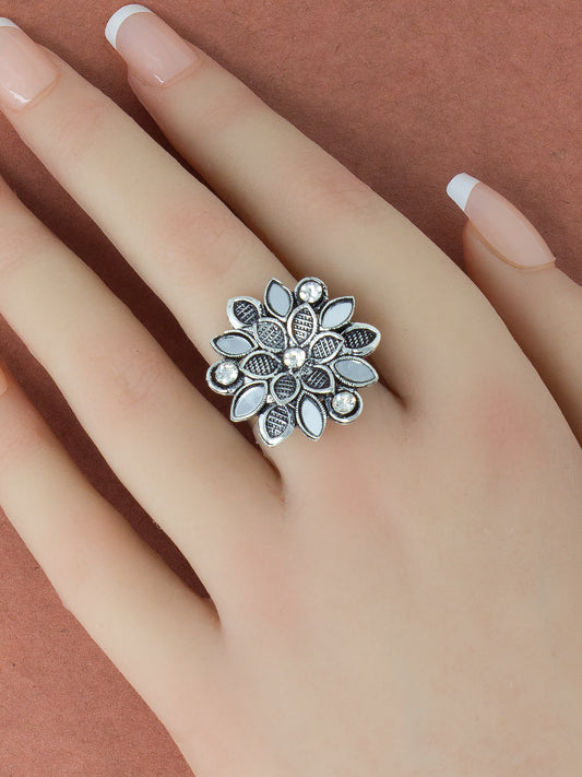 Silver-Plated Mirror-Studded & Beaded Jewellery Set With Adjustable Finger Ring