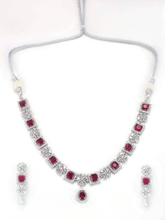 Rhodium-Plated Red American Diamond Studded Jewellery Set