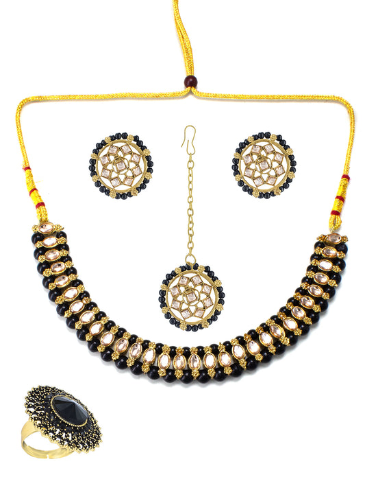 Gold-Plated Black Stone Studded & Beaded Jewellery Set With Maangtika & Adjustable Finger Ring