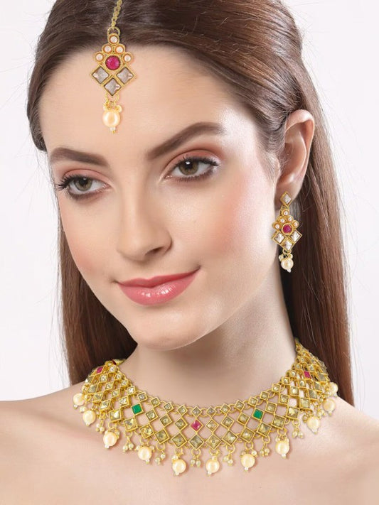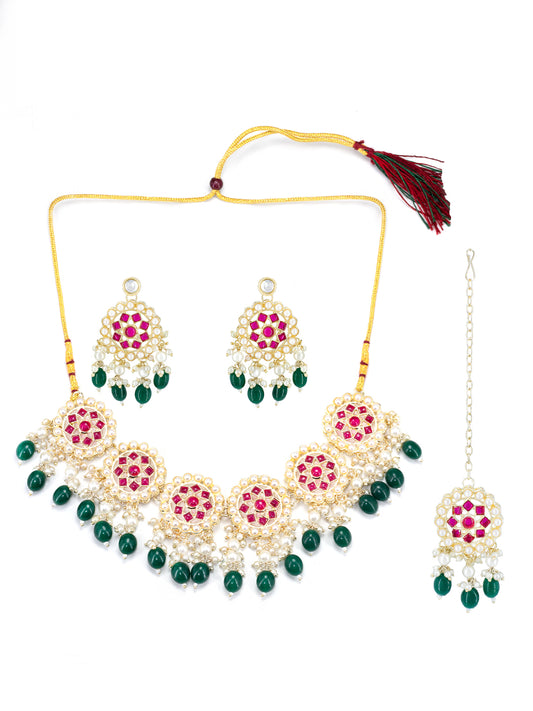 Gold-Plated Kundan Studded & Beaded Jewellery Set With Maangtika