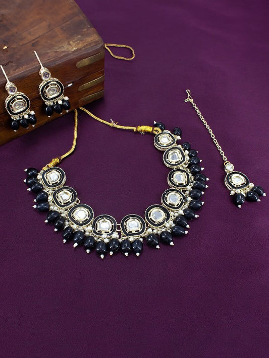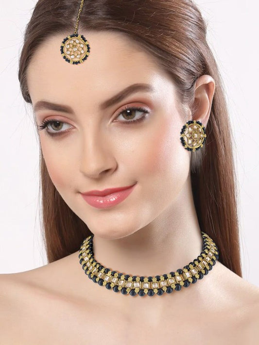 Gold Plated Black Kundan Stone Studded & Beaded Jewellery Set With Maangtika