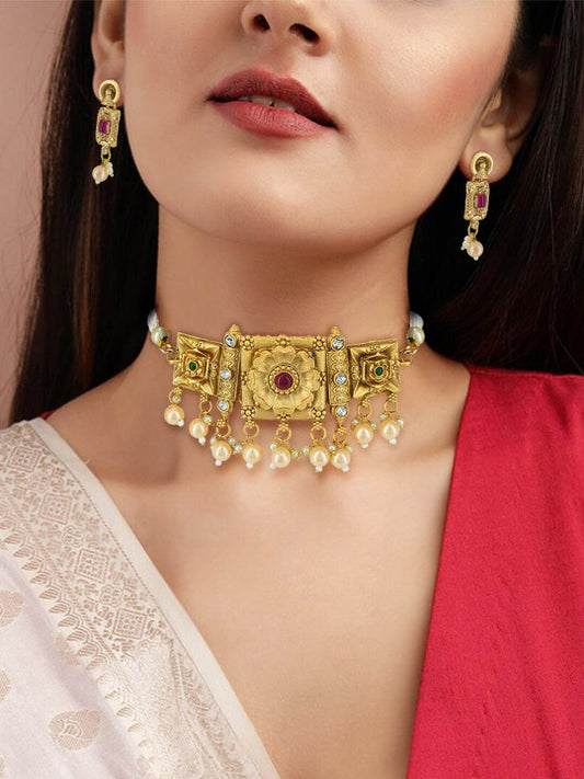 Gold-Plated Floral Stone-Studded & Beaded Jewellery Set