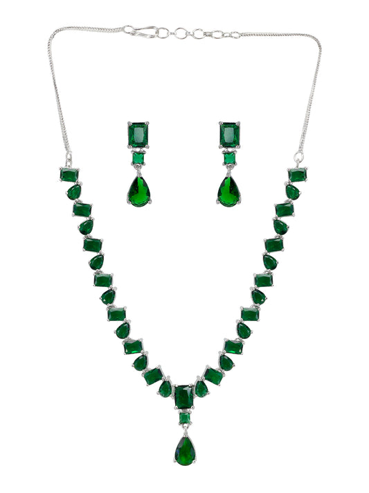Rhodium Plated American Diamond Studded Green Jewellery Set