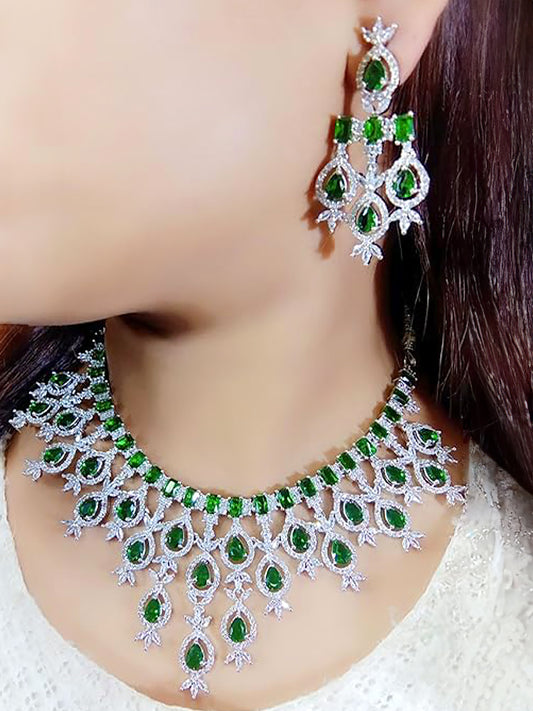 Rhodium Plated Green Teardrop Shaped American Diamond Studded Jewellery Set