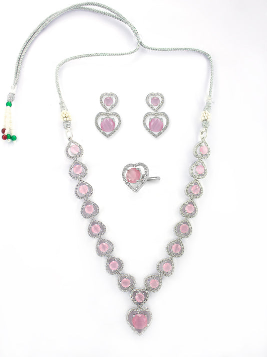 Rhodium Plated Heart American Diamond Studded Jewellery Set With Finger Ring