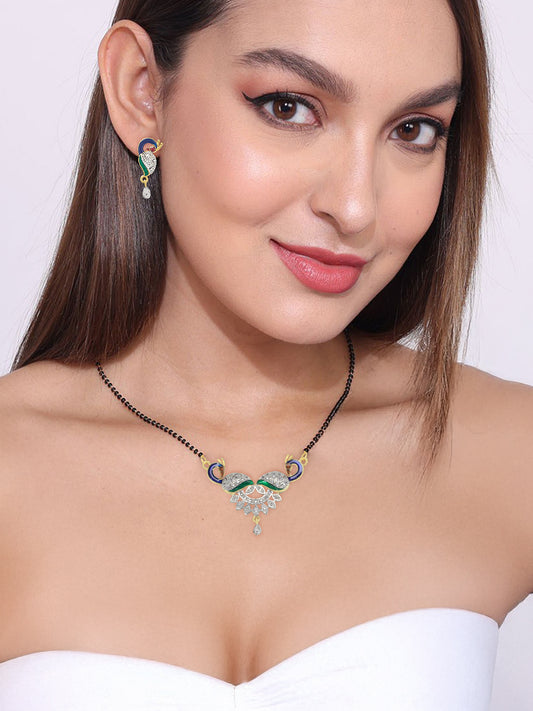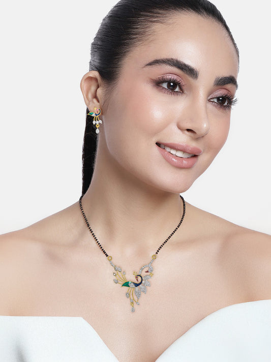 Gold Plated Peacock American Diamond Studded Mangalsutra With Earrings