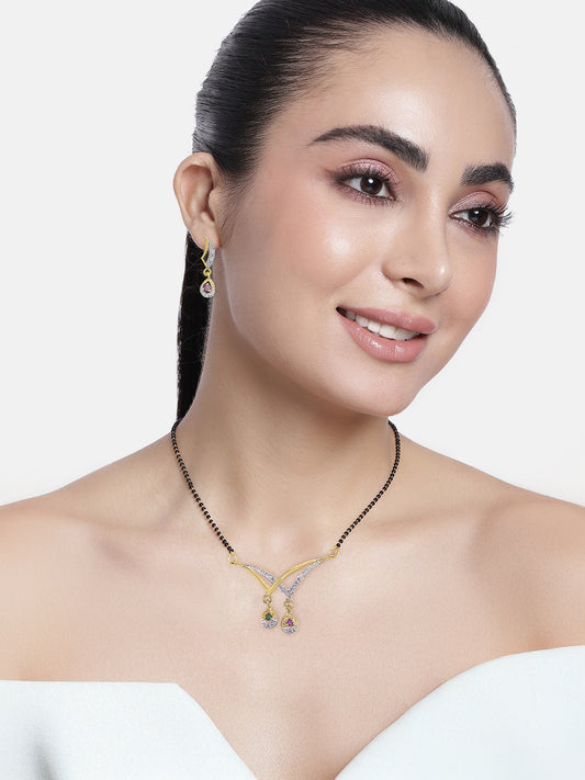 Gold Plated American Diamond & Black Beaded Mangalsutra With Earrings