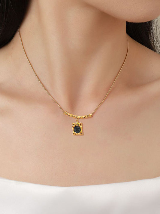 Stainless Steel Black Stone Chain Necklace | Gold Plated Black Stone Studded Pendant Style Chain Necklace