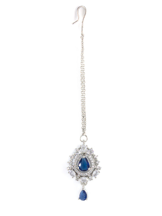 Silver Plated Blue AD Tear Drop Maang Tikka