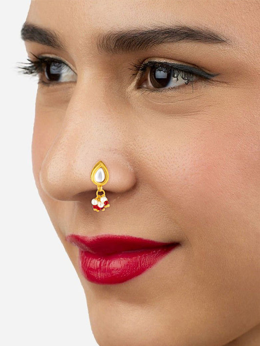 Gold Plated Red & White AD Nose Ring with Pearl Chain