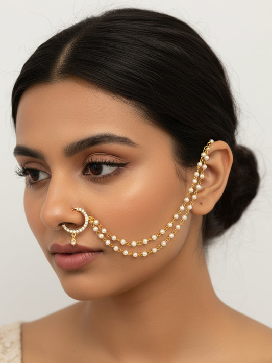 Gold Plated AD Nose Ring with 2 line Pearl Chain