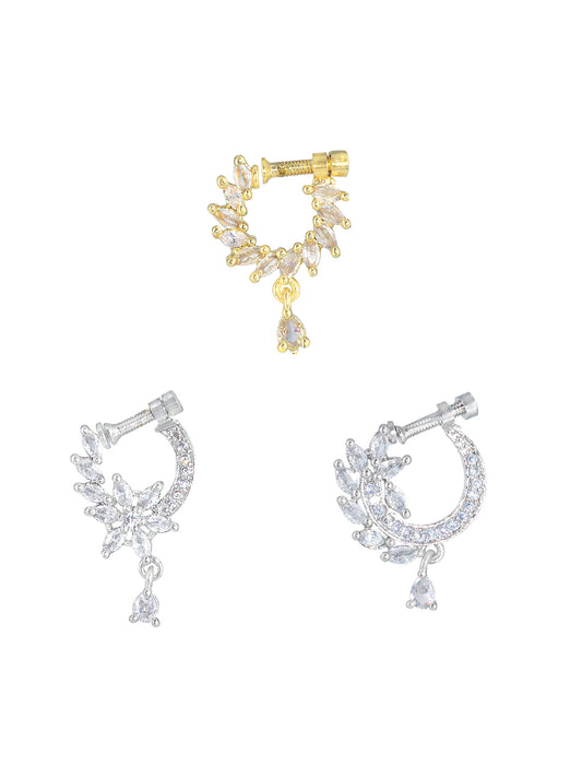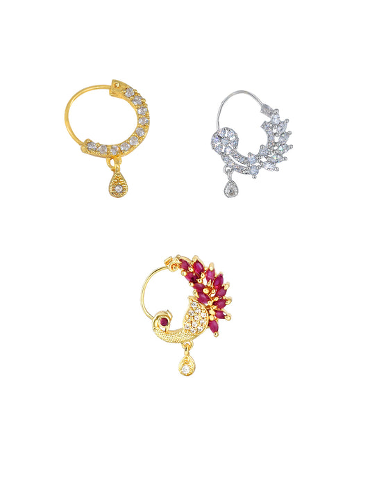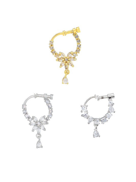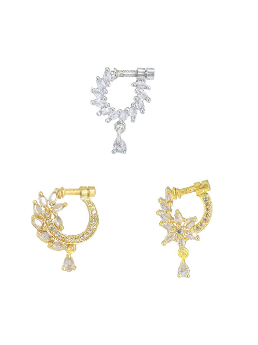 Set of Three Rhodium & Gold Plated American Diamond Non Piercing Nosepin